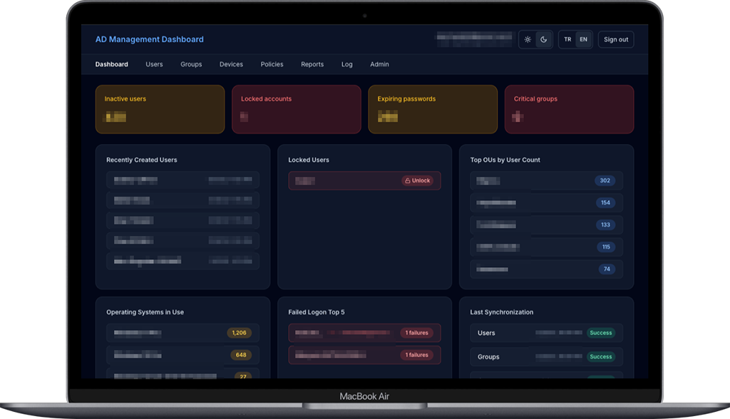 Active Directory içinde kaybolmayın. Kullanıcı, grup, cihaz listeleri. Pasif elementlerin raporlanması. Kullanıcı hesaplarının aktif/pasif, lock kontrolü ve isteğinize göre eklenecek ek modüller.