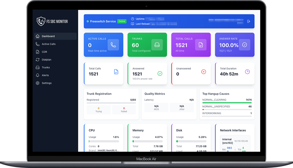 Freeswitch'in terminal dünyasının ötesine geçiyoruz. Gerçek zamanlı çağrı trafiği, trunk takibi, metrikler ve sunucu performansı ve isteğinize göre eklenecek diğer modüller. Hepsi bu uygulamada!