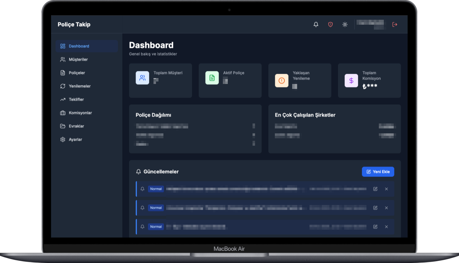 Sigorta bayilerini poliçe takibi için özelleştirilmiştir. Teklifler, yenilemeler, komisyonlar ve isteğe göre geliştirilecek modüller uygulanabilir.